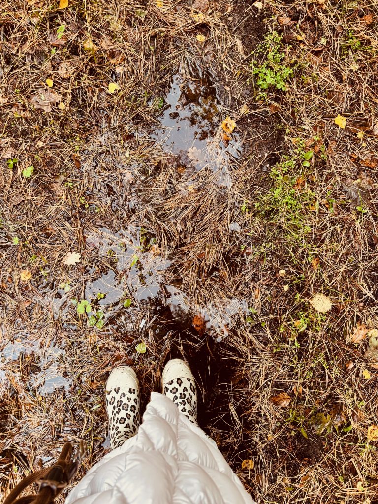 Und genauso fühlt es sich für mich an, während ich mit Rudi durch den Wald stapfe. Ich fühle mich warm, bewusst im Moment und nehme achtsam wahr, was mich umgibt und was es in mir auslöst. Ich lausche dem Wind, ich betrachte, wie die Bäume ihre Blätter fliegen lassen und freigeben, ich sehe, wie sich der Himmel in den Pfützen spiegelt. Ich bin dankbar für alles, was jetzt ist. Und ich weiß, dass es Vieles gegeben hat, sowohl Gutes wie auch Unschönes, was mich hierher getragen hat. Ich gebe mich dem hin und versuche, loszulassen und Nichts zu halten. Dann passiert es: Es laufen Tränen über meine Wangen: